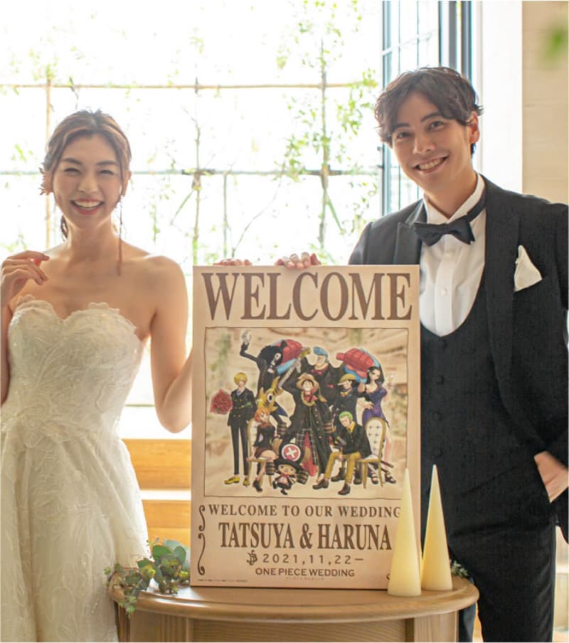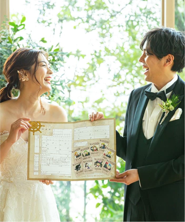 One Piece Bridal Fair es un servicio exclusivo de Escrit, que incluye una recepción con el tema principal de la serie, un certificado de matrimonio personalizado con carteles de recompensa de los personajes y un lindo poster conmemorativo de la boda.