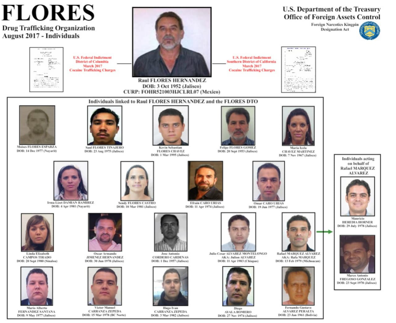 Un sujeto llamado Mario Fernández aparece junto a Julión y a Rafa Márquez en la lista de testaferros del narcotraficante Raúl Flores Hernández, de acuerdo con el Departamento del Tesoro de EEUU. Ese nombre es el mismo de personas vinculadas con el cantante y con Valentín Elizalde.