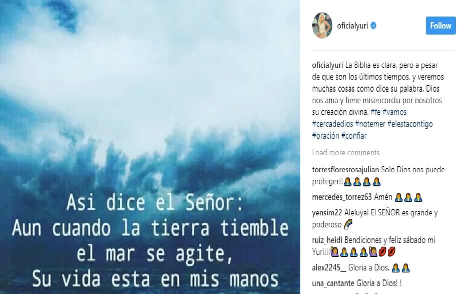 Los fenómenos naturales que azotan en este momento al continente americano, tienen muy nerviosos a muchos famosos, como lo demostró la cantante mexicana Yuri en sus redes sociales, desde donde pidió a sus seguidores tener fe y orar.