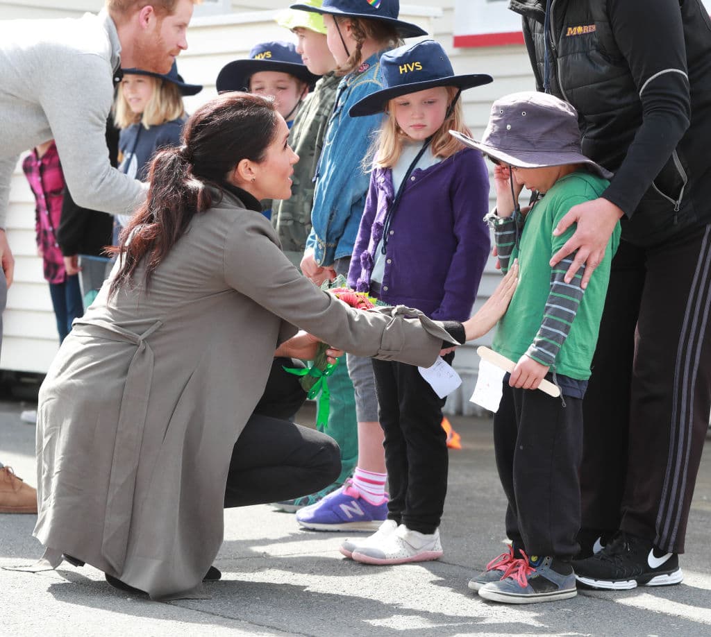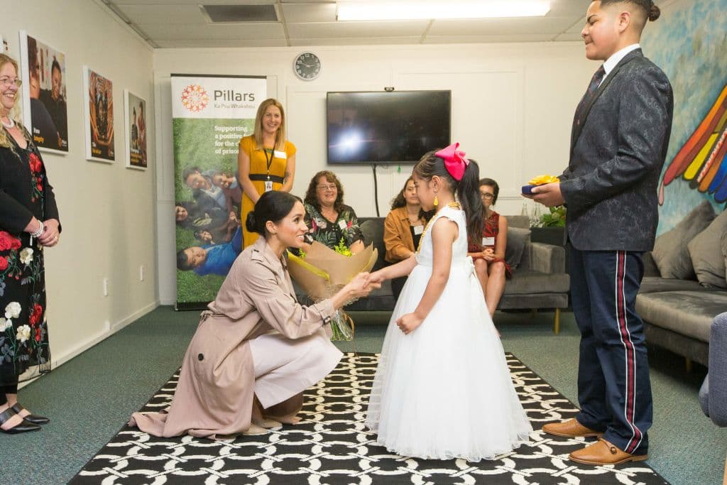 En Auckland, Nueva Zelanda, Meghan se enterneció con las flores que esta pequeña de la Fundación Pillars le entregó como regalo. No sólo las recibió con gran cariño, charló brevemente con ella y se agachó para observarla a su altura.