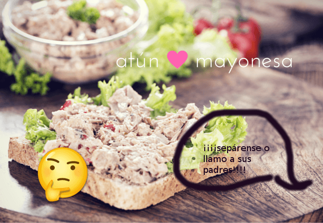 El atún es pescado y la mayonesa está hecha de huevo que viene de las gallinas y a quién le importa, porque una viene en un frasco, el otro en una lata, y se complementan a la perfección.