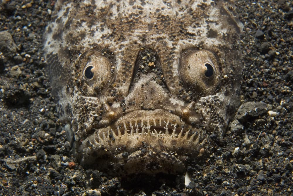 La apariencia este animal, que se esconde en la arena, puede resultar algo más aterradora. Así tiene que ser para poder camuflarse en su entorno.