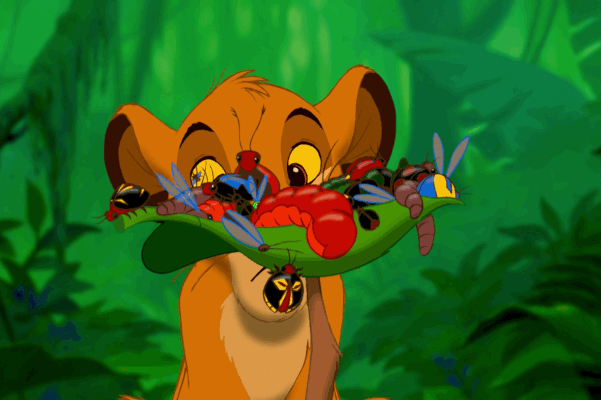 Timón: Mira chico, si vives como nosotros, comerás como nosotros. ¡Mira! Aquí parece que hay bocadillos ricos.