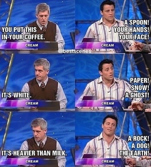 Conductor - Le pones al café Joey - Una cuchara, tus manos, tu cara Conductor - Es blanco Joey - Papel, nieve, un fantasma Conductor- Es más pesado que la leche Joey - Una piedra, un perro, la tierra