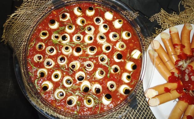 Amasa carne picada junto con trocitos de queso y haz bolitas que puedas cocinar en una sartén, como si de albóndigas se tratase. Una vez retiradas, añade aceitunas rellenas de pimiento rojo y colócalas de forma dispersa sobre las bolas de carne, de modo que simulen los ojos amenazadores de ese monstruo viscoso con el que tus hijos no querrían toparse en la noche de Halloween.
