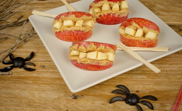 Corta una manzana y recorta hasta que obtengas la base para esa terrorífica boca que rellenarás posteriormente. Una vez perfilada, unta el interior con mermelada de fresa y clava piquitos hechos con almendra en cada uno de los "labios" de este experimento. Otra opción reside en recortar dos rodajas de manzana, especialmente verde o roja, y apoyar una encima de la otra de modo que en el espacio restante puedas introducir daditos de la propia manzana.