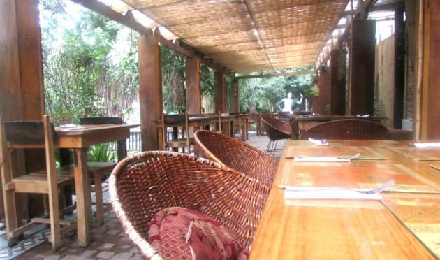 El lugar está súper bien ambientado: sillas de mimbre, cortinas de bambú y muchas deidades asiáticas de piedra, además de enredaderas y una pequeña piscina.