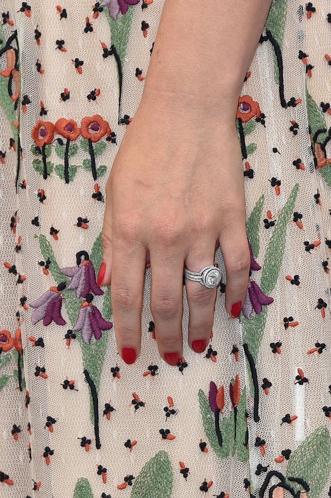 El anillo de la actriz de 6 quilates fue diseñado por su esposo, Adam Shulman, quien acudió a Kwiat, un fina joyería. Aparentemente el anillo costó 150 mil dólares.