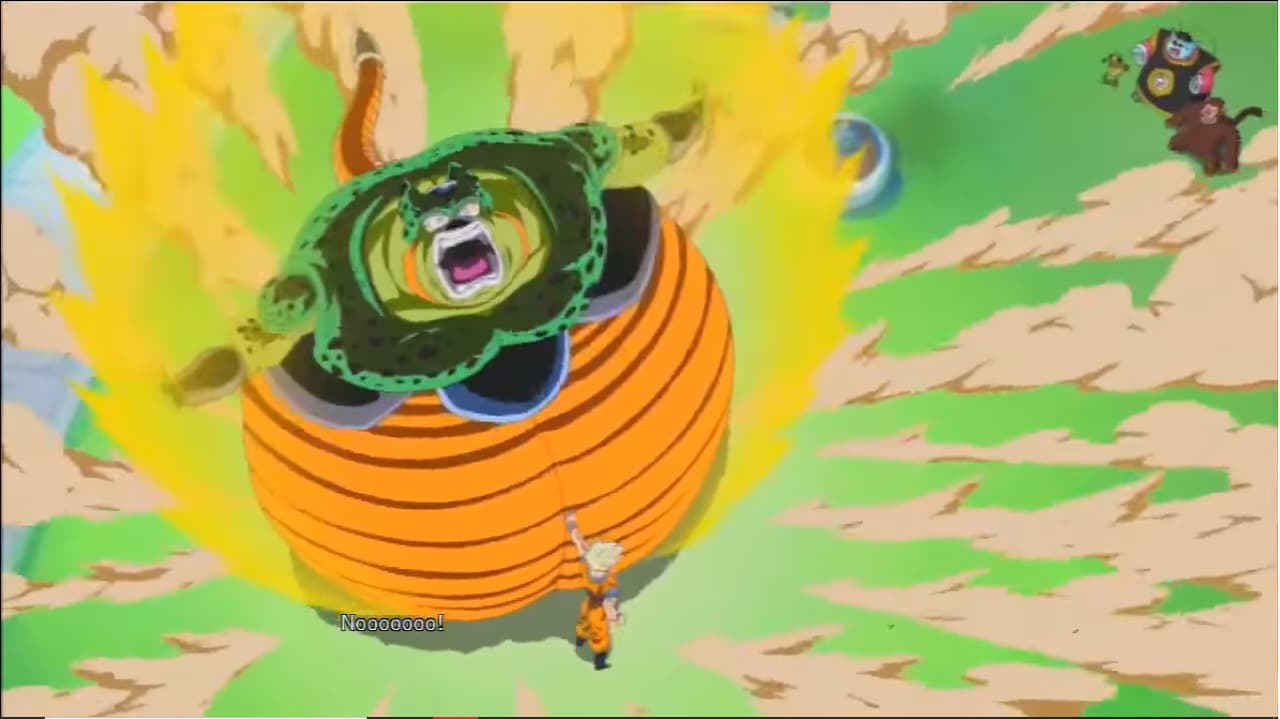 Gohan super saiyajin 2 acorraló a Cell, y justo cuando parecía perdido, el androide biomecánico se infló para autodestuir su cuerpo y hacer explotar la Tierra. Goku se despide de sus amigos y su hijo, toca a Cell y se teletransporta al planeta de Kaio-sama donde estalla y se lleva la vida de Goku y el dios del norte.