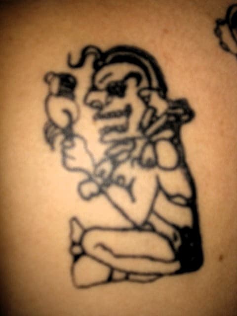 Y por ultimo, un dios Maya en el omoplato izquierdo. Se trata de Ah puch o el señor Kisín, es el Dios Maya de la muerte, es vengativo y rencoroso. Aline nos dice que su intención al hacerlo en la parte superior y a sus espaldas, es para que la cuide de aquellos a quienes ella no puedo ver y que desean lastimarle.