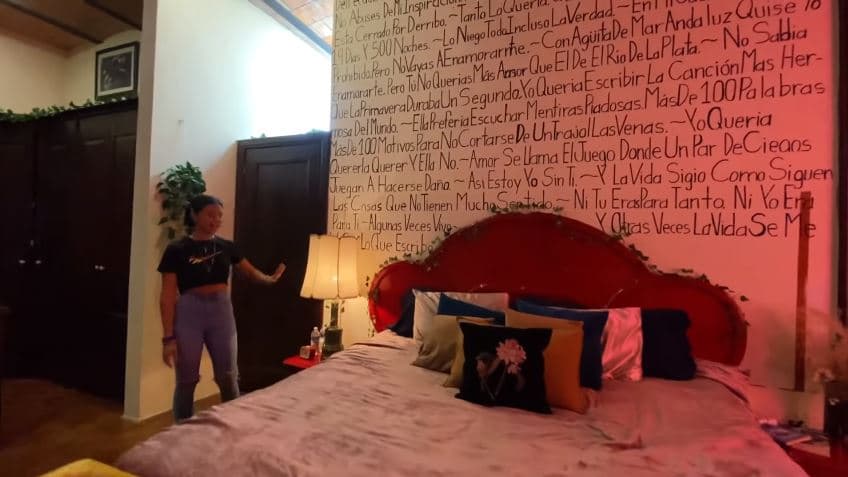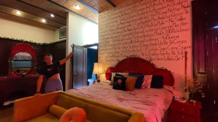 Después, la hija de Pepe Aguilar mostró la pared detrás de su cama. Sobre esta, tiene escritas varias frases de canciones de Joaquín Sabina, ya que confesó que es fan de él y que muchas de sus letras la inspiran.