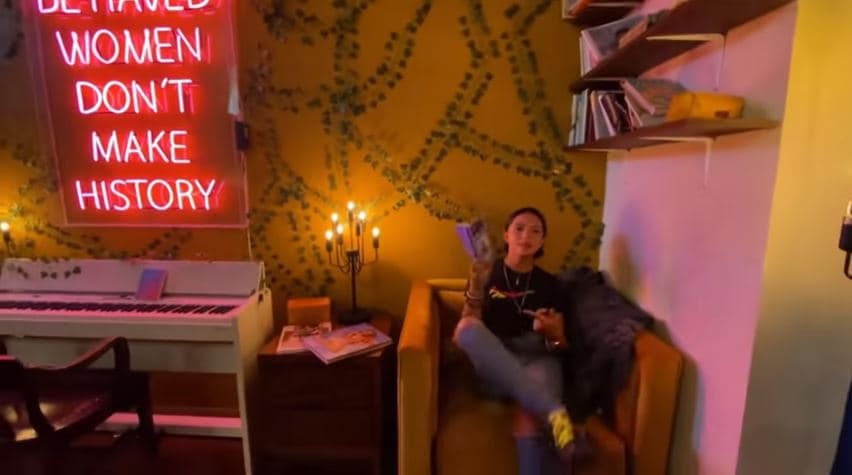 A un lado tiene un piano en el que se sienta a componer su música. Sobre este tiene unas luces neón con la frase «well behaved women don’ make history» (las mujeres bien portadas no pasan a la historia).