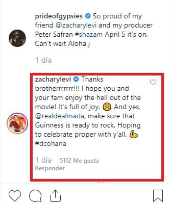 «Estoy muy orgulloso de mi amigo @zacharylevi y del productor Peter Safran. #Shazam estrenará el 5 de abril. No puedo esperar ¡Aloha!».