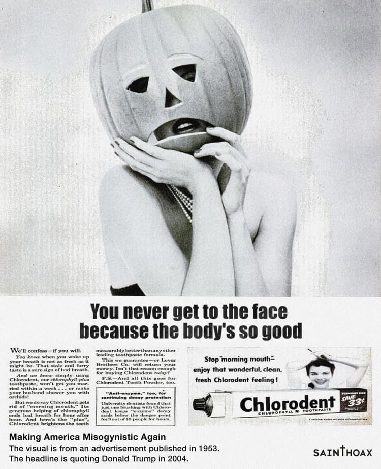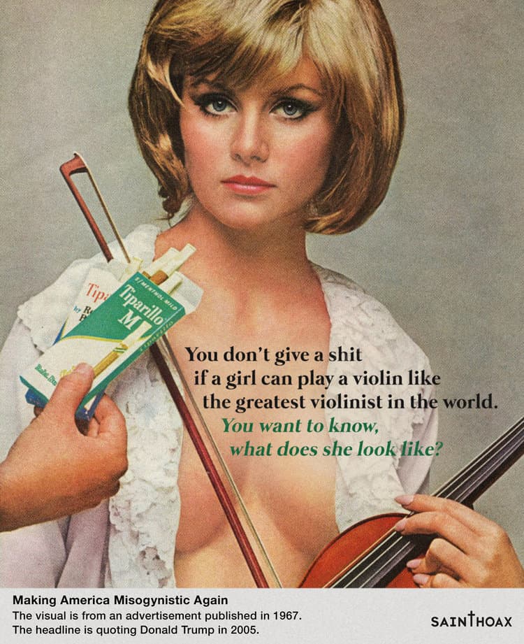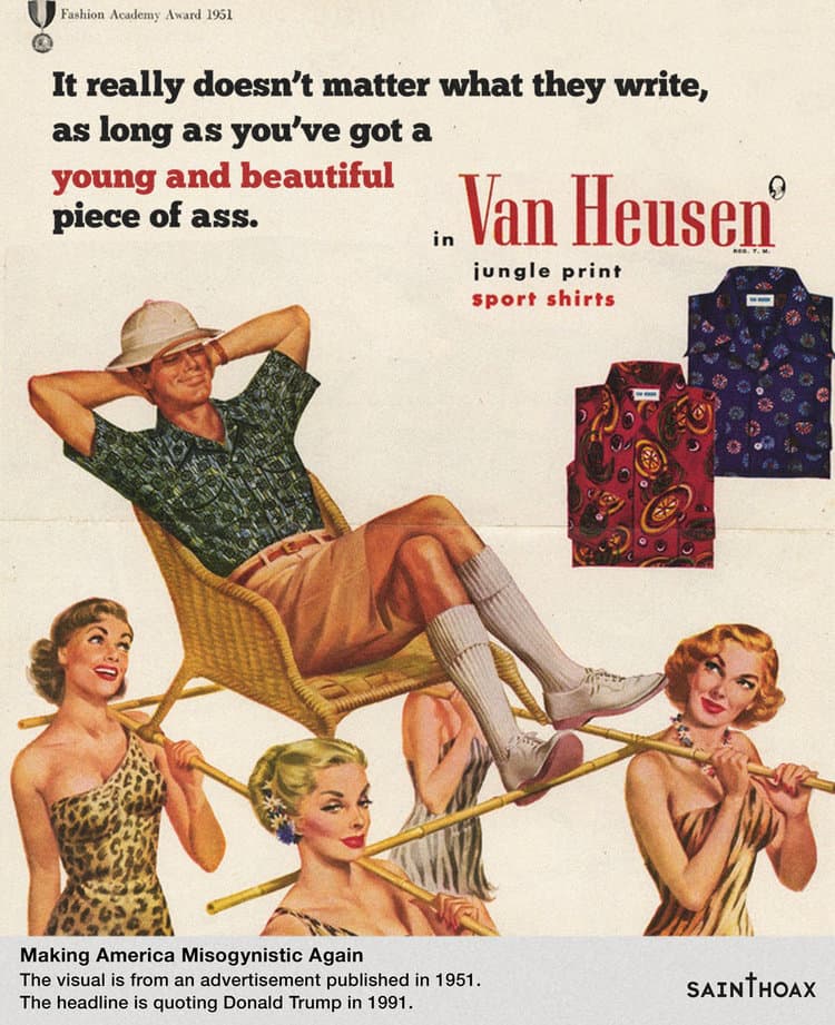 Lo maravilloso del arte es que nos da la oportunidad de expresarnos ante los asuntos del mundo que nos molestan. Un artista tiene la libertad de utilizar el medio que guste y decir lo que le dé la gana. Tal es el caso de Saint Hoax, un artista anónimo que pasa su tiempo entre Beirut y Nueva York. En el día internacional de la mujer decidió lanzar un proyecto donde reemplaza slogans de anuncios publicitarios de los años 50 con frases que ha dicho Donald Trump a través de los años.