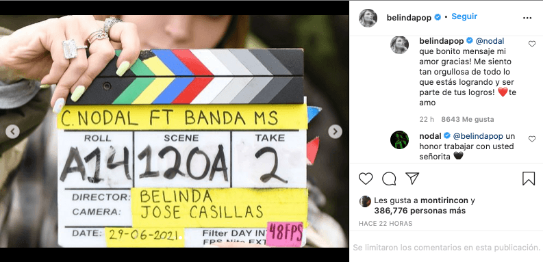 Con esta publicación también pudimos ser testigos del gran amor que Belinda y Nodal comparten. El cantante de 'Botella tras botella' dejó un bello mensaje en la sección de comentarios en donde dejó en claro lo orgulloso que se siente de su novia y el gran honor que fue trabajar con ella. Incluso la calificó como «la mejor directora que existe».