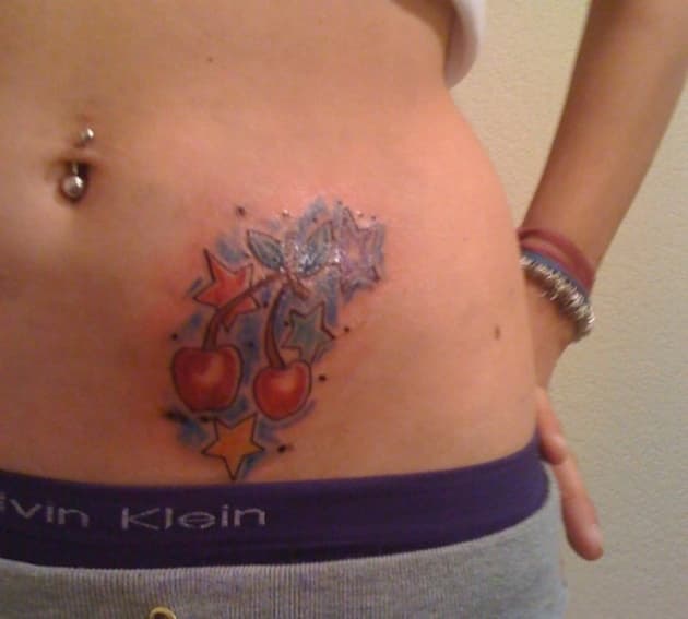 Karla se ha tatuado unas bonitas cerezas con estrellas sobre la parte izquierda de su pelvis, de color rojo sobre fondo verdoso. Para ella este tatuaje significa muchísimo, pues en él se recuerdan sus hermanos y su mamá, por lo que su valor para ella es notable.