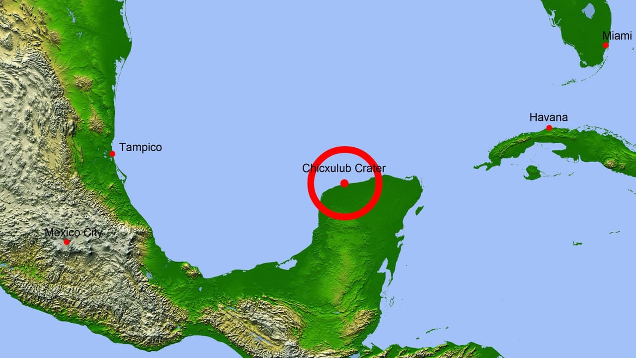 La evidencia de este suceso resultó ser un cráter de más de 150 kilómetros de ancho, el cual lleva el nombre de Chicxulub, un pueblo, un pequeño pueblo cercano a este punto.