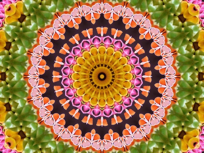 Si elaboramos una explicación sencilla sobre el funcionamiento de un caleidoscopio podríamos decir que se trata de una superficie llena de elementos, en este caso, pedazos de vidrio u otros objetos de colores, dentro de un cuerpo cuyo interior espejado refleja hacia todos los lados lo que está exáctamente en medio del mismo. De esta manera, se crea una vista homogénea y reproducida varias veces del bello caos formado en el interior del caleidoscopio.