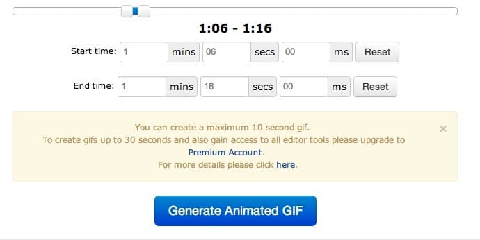 GifSoup te permite crear imágenes animadas con hasta 10 segundos de duración. Los cuadros de Star Time y End Time, indica el minuto o segundos correspondientes al video, en que empezará y terminará tu gif.