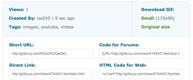 La aplicación va a generar la imagen animada final (va a tomarle algunos minutos). Al terminar, podrás descargarlo directamente a la computadora, obtener una dirección URL para el acceso o aprovechar los códigos para insértalo en blogs y foros.