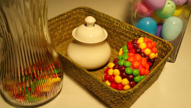 También puedes usar Skittles para decorar tus huevos Easter. Hierve los huevos y dejalos enfriar. Luego usa pasta de decorar galletitas para pegar las coloridas delicias en toda la superficie del huevo. Para hacerlo más divertido y llamativo, decoralos con algún patrón o diseño en específico.