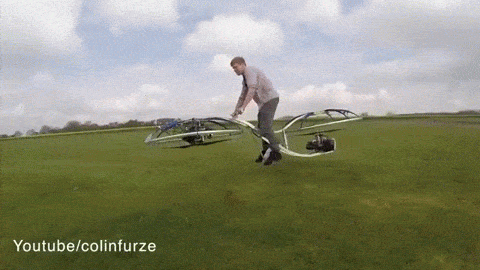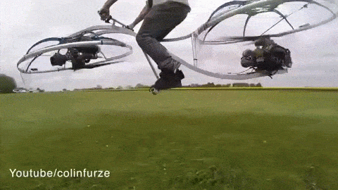 Es en parte una motocicleta voladora, o dos helicópteros miniatura, o una bicicleta voladora a motor.