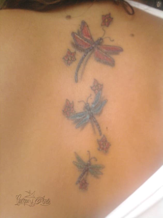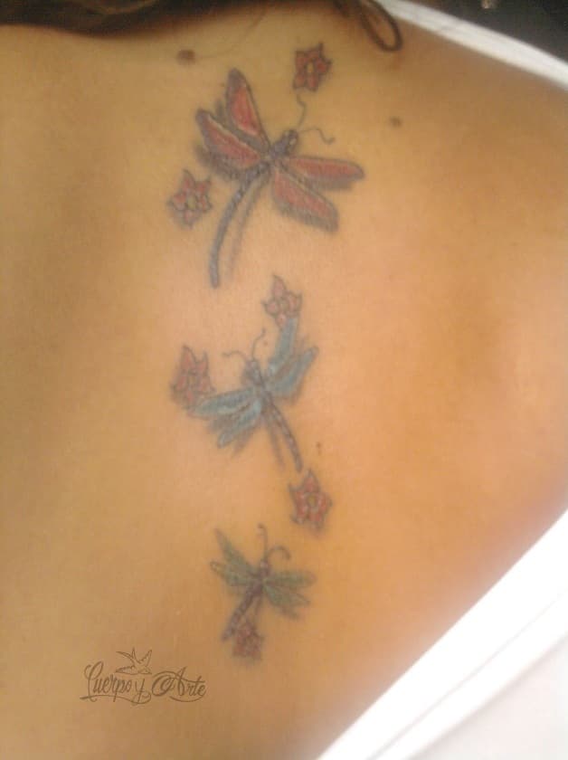 Ella ha decidido compartirnos imágenes del diseño y el motivo por el que se tatuó tres libélulas en el medio de la espalda. La primera es color rosa y un poco más grande que las demás, representa a su hija mayor, mientras que las otras dos, una es de color azul y la última es verde, simbolizan a sus dos hijos menores.