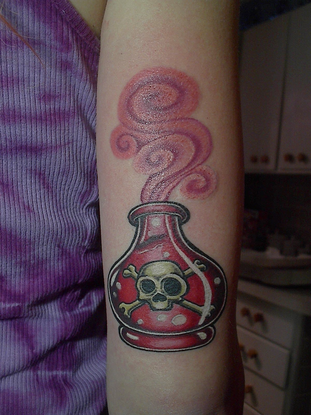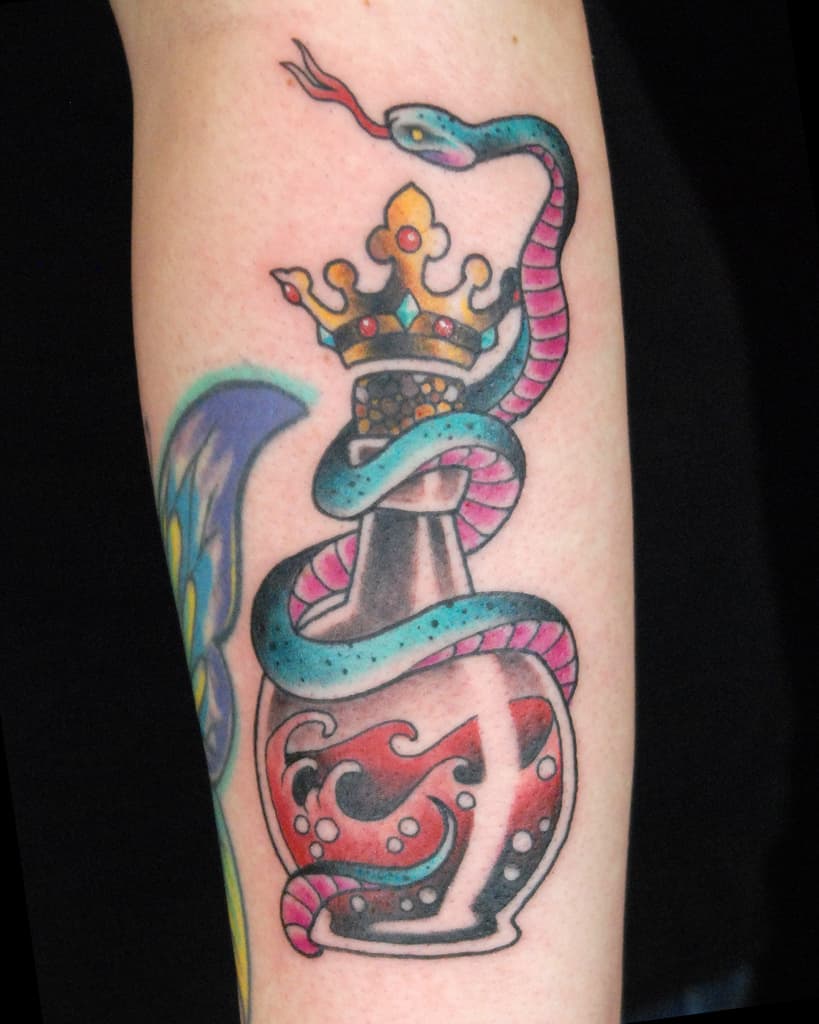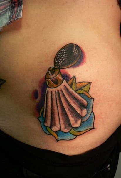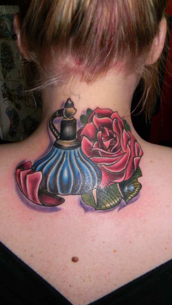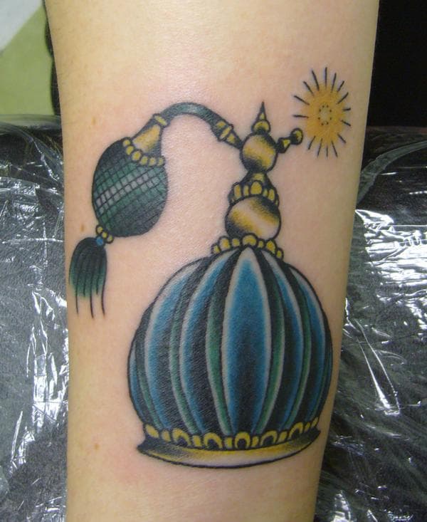 Otro tipo de diseño para estos tatuajes es el de la antigua botella de perfume. Antes, las fragancias no venían en los frascos que conocemos hoy, sino que se las colocaba en unos perfumeros muy bonitos, como el que se aprecia en la fotografía del tatuaje a continuación.