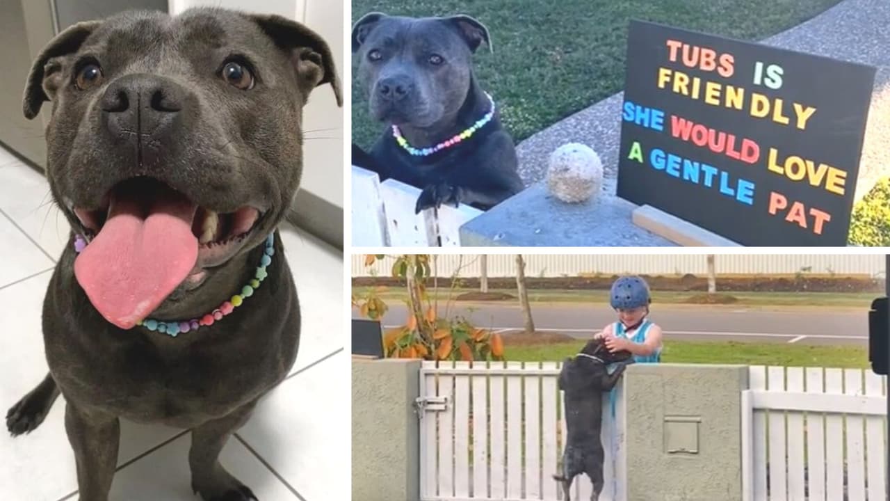 Se trata de Tubs, una Bull Terrier que vive en Townsville, Australia y adora ser acariciada. Aunque sus dueños le dan una gran dosis de cariño al día, esta no es suficiente por lo que diseñaron un plan para que las personas interactuaran con ella.