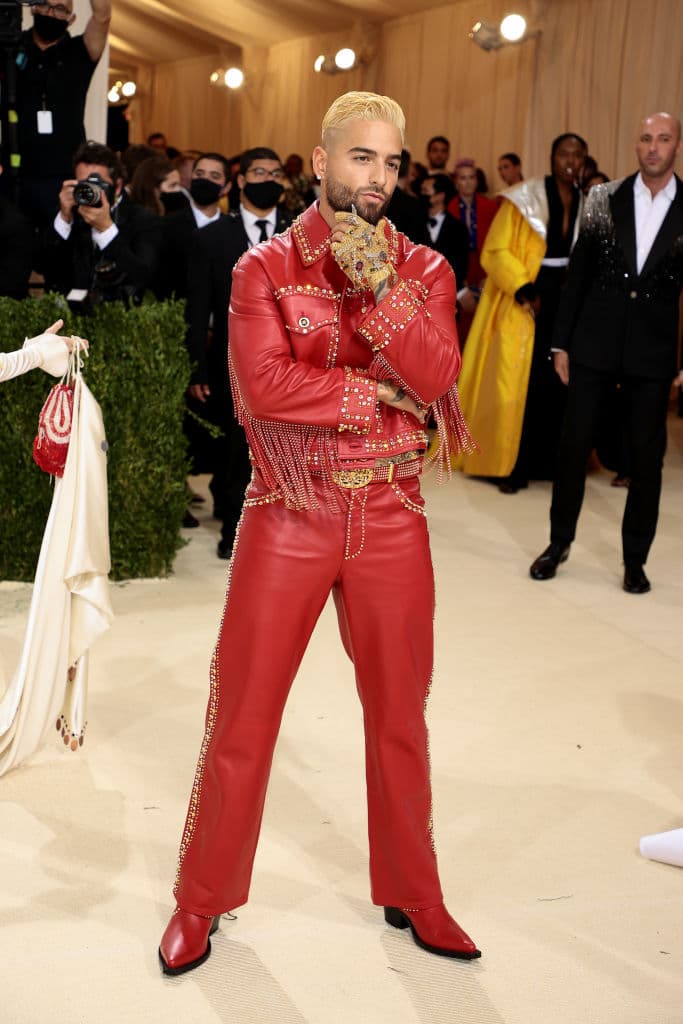 El cantante colombiano encantó a los espectadores con un sexy look de cowboy, luciendo un conjunto de piel roja e incrustaciones de la marca Versace.