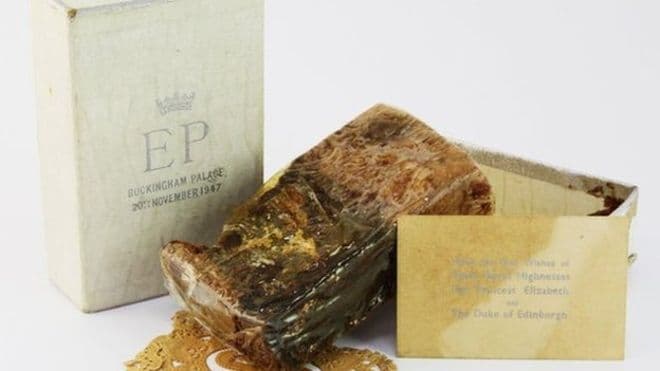 Al parecer una rebanada del pastel de bodas que fue servido en 1947 fue conservada en perfectas condiciones y vendido en una subasta por 560 libras esterlinas. La BBC aseguró que incluso venía con la envoltura original y una carta deseando lo mejor por parte de la Reina y el príncipe Felipe.