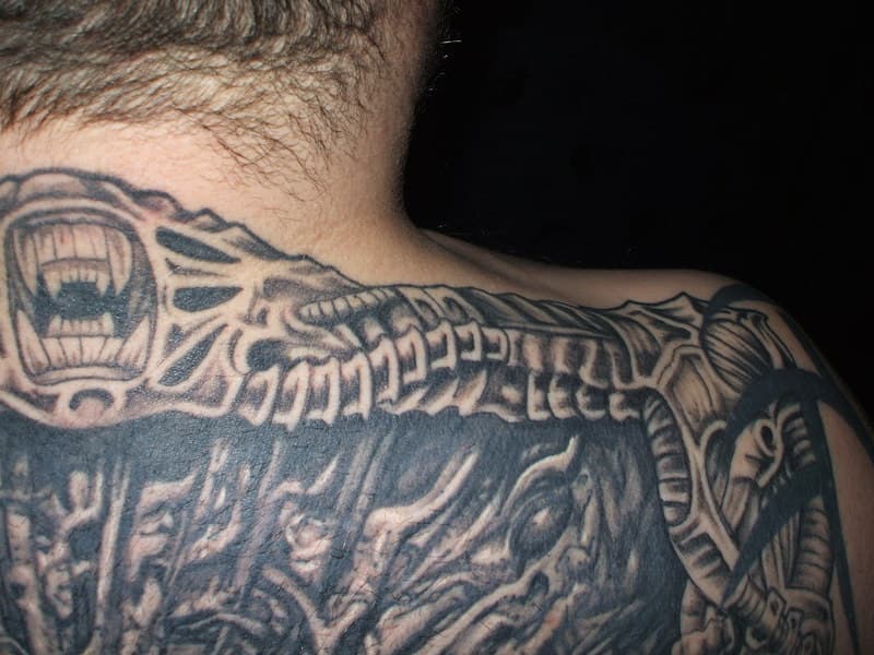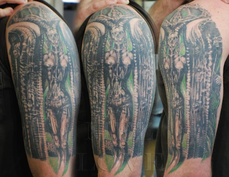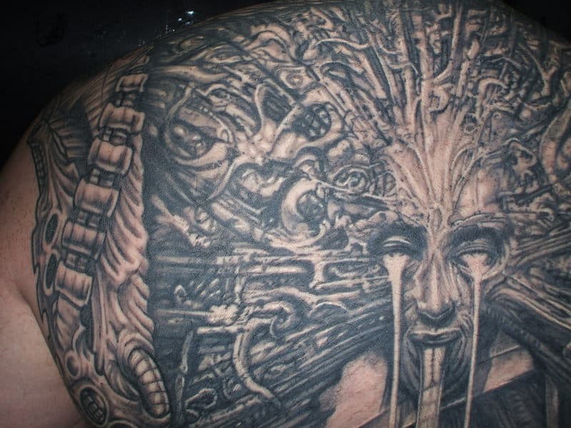 ¿Qué habría sido de la escuela biomecánica sin el arte de Giger? Pues nada. Reconocido por sus macabras y oscuras creaciones, surrealistas, excéntricas y verdaderamente aterradoras, de la mano de una de sus obras maestras (las ilustraciones de las criaturas y el universo de Alien), Giger contribuyó al mundo del arte corporal de forma excepcional.