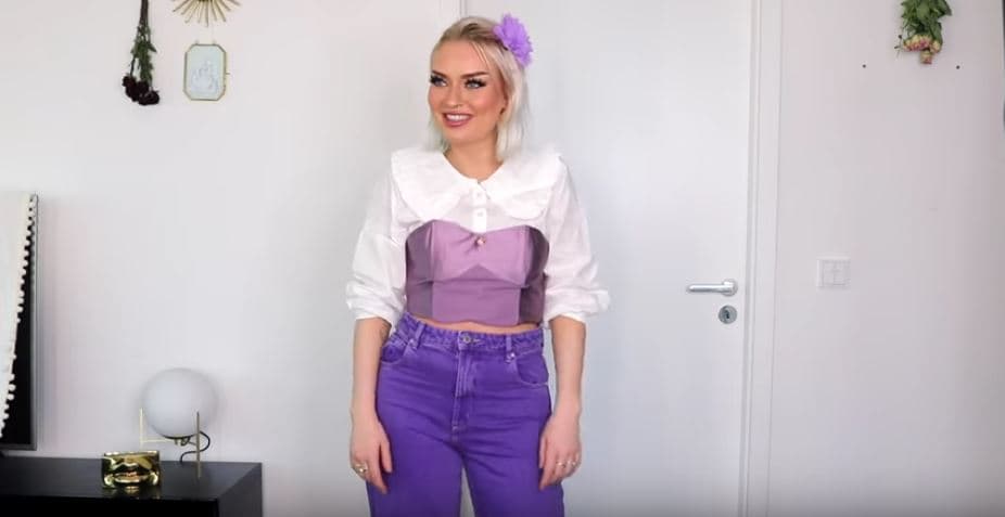 Para este outfit, se puso un par de jeans morados, una camisa blanca; y encima un crop top estilo bustier en color lila. Como complementos, utilizó unos tenis de plataforma y una flor en el cabello.