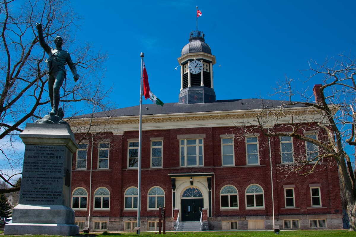 El montaje tiene algunos trucos porque el interior de la biblioteca es una mezcla de varias locaciones; sin embargo, el exterior es el Ayuntamiento de Port Hope.