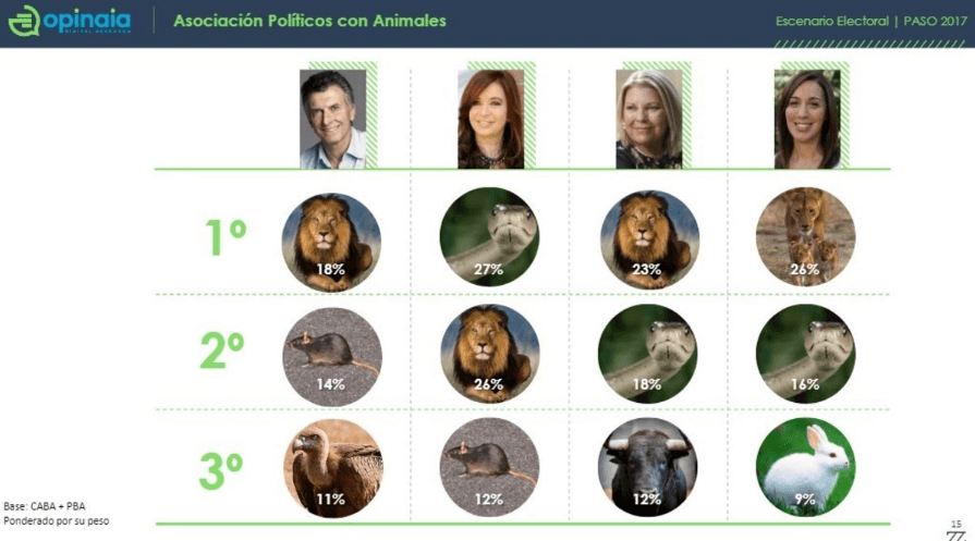 La consultora Opinaia lanzó una peculiar encuesta llamada « Asociación Simbólica con Animales», la cual se hizo para determinar con cuáles animales relacionan las personas a cada uno de los políticos en función de sus atributos.