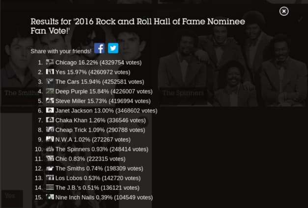 El Hall of Fame también es un hermoso museo que funciona en Cleveland, Ohio y existe desde 1983. Entre los nominados por primera vez están Chicago, Steve Miller, Chaka Khan, Cheap Trick, The Cars, The J.B.'s, Los Lobos y Janet Jackson (que acaba de lanzar su primer álbum en siete años y está de gira). El grupo Chic estuvo nominado diez veces, ¿tendrán suerte este año?