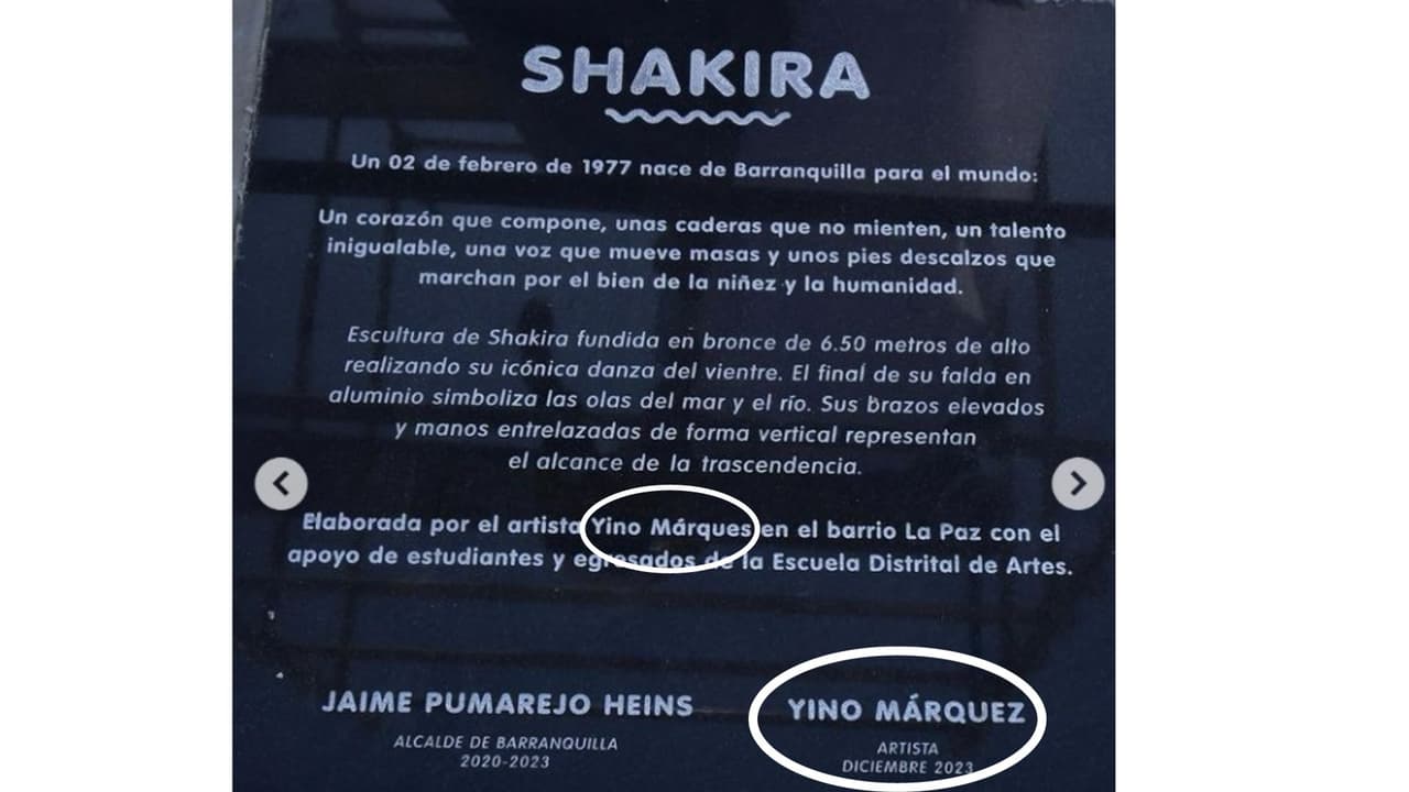 Estatua de Shakira tiene un error en la placa: el nombre del artista Yino Márquez está mal escrito
