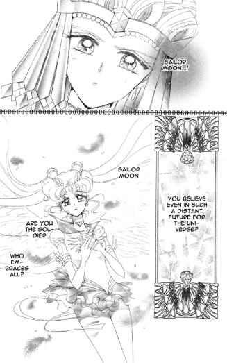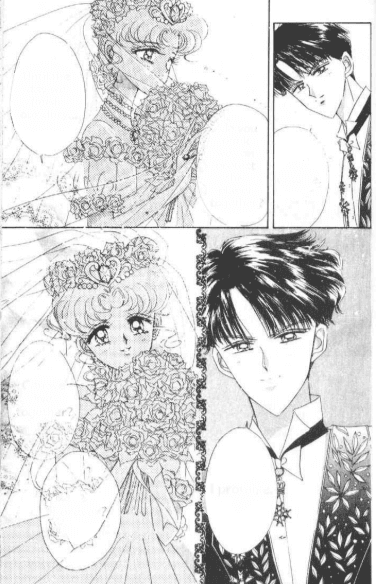 Los enamorados cierran su compromiso con un beso. Serena dice sentirse inquieta (no la culpamos tras tanto estrés de súper heroína combinado con el estrés prematrimonial) y al expresarle sus temores de morir a su ahora esposo, éste le dice que de igual forma volverán a renacer y reencontrarse una y otra vez (Darien entendió muy bien la lógica de esta historia).