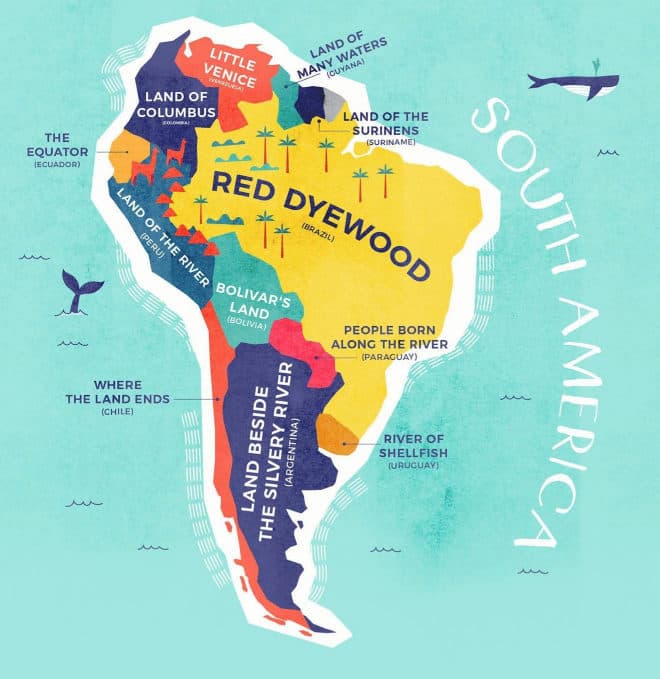 Aquí encontraron variaciones en algunos nombres debido a la gran cantidad de culturas que se encuentran mezcladas. Uno de esos es Uruguay, que significa "Cola de ave acuática" o "Río de los crustaceos"; Brasil puede ser "Rojo como las brazas" o "Las rojas maderas tintoreas". También está el significado de Venezuela que es "La pequeña Venecia"; y Chile, que significa "Donde termina la Tierra".