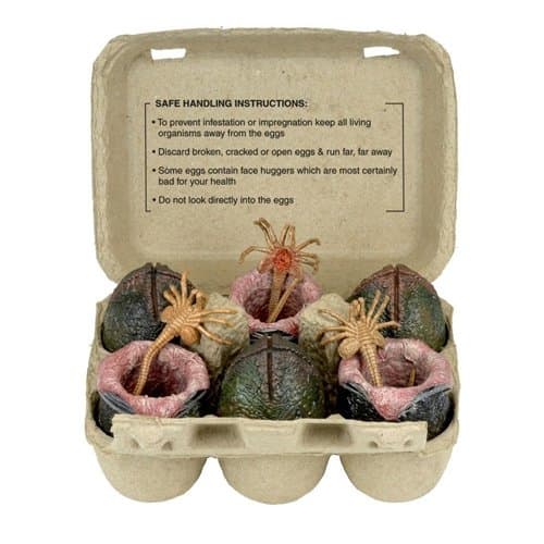 Pero esto no es todo, puedes guardar tus galletas dentro de un huevo de xenomorfo o quizá poner sal a tus papas fritas con un huevo de xenomorfo, o… comprar literalmente un pack de 6 huevos de xenomorfo, con instrucciones muy precisas acerca de cómo tienes que salir corriendo si ves uno de estos huevos. Como quien compra huevos normales en el supermercado…