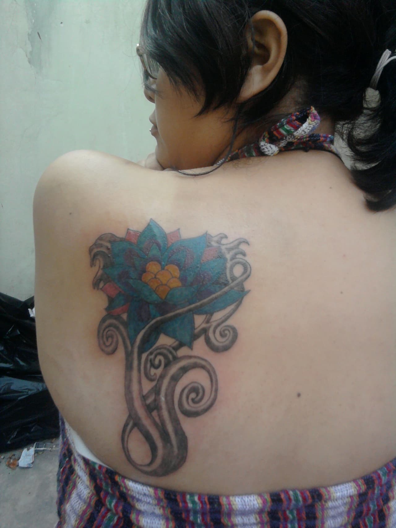 Cubriendo prácticamente todo su omóplato izquierdo Yessica ha estampado en su piel un muy bonito diseño, con un loto que se pierden entre azul-verdosos, rojos y amarillos, envuelto en un tribal que nace de su tallo y lo rodea en su totalidad.