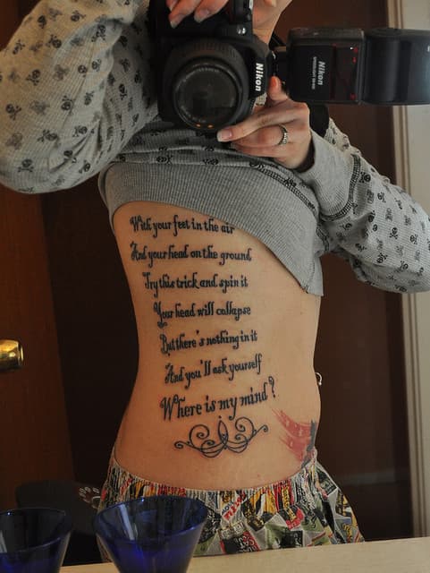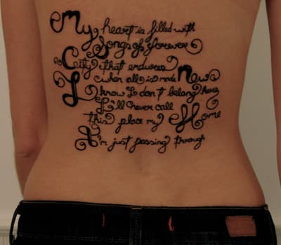 Puedes jugar mucho con el diseño de los tatuajes de letras de canciones. Dependiendo del lugar que escojas para situarlos, puedes elegir entre una infinidad de fuentes, por ejemplo. También puedes decidir tatuarte la canción entera o tan sólo una parte; muchos optan por tatuarse sólo el estribillo.