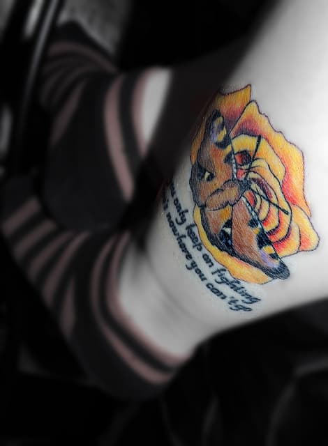 Por otra parte, puedes acompañar el texto con imágenes o detalles que guarden algún tipo de relación con la canción que elijas. Por ejemplo, un tatuaje de la letra de la canción Strawberry Fields de Los Beatles podría ir acompañado por la imagen de una frutilla. O simplemente puedes decorarlo con alguna nota musical, un instrumento, flores, ¡lo que tú quieras!