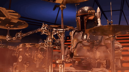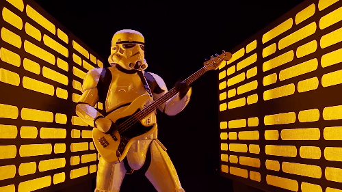 Así podemos ver a Darth Vader en la guitarra líder o a Boba Fett detrás de la batería.