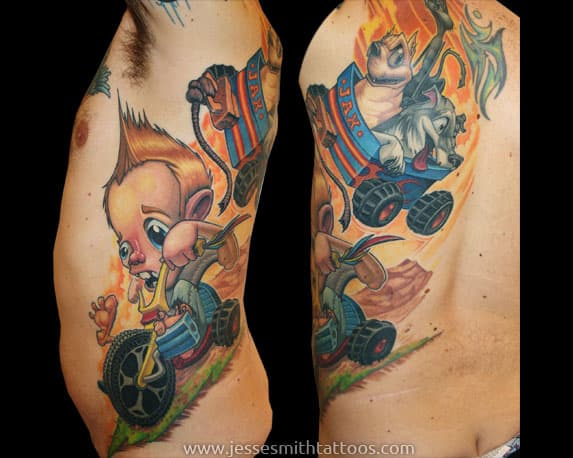Jesse Smith se caracteriza por su habilidad para realizar " cover ups", es decir, tatuajes encima de otros tatuajes que quedaron mal o feos, o de los que el dueño se quiere deshacer. Y sinceramente me parece que ha resuelto de manera muy original y creativa los distintos desafíos que sele han planteado al momento de "emparchar" un tatuaje.