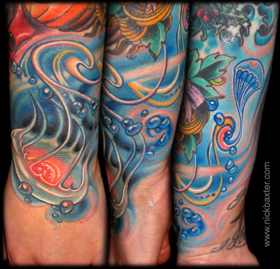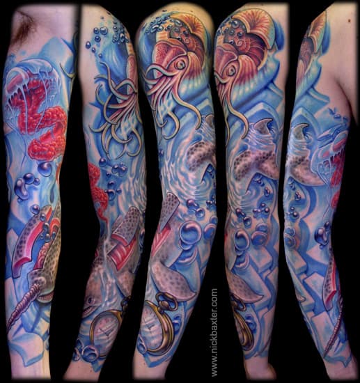 Llegamos al tercer gran tatuador de estos tiempos: el ecléctico Nick Baxter, un renombrado y versátil artista que se renueva constantemente diseño a diseño, mostrando mundos de fantasía que se acoplan a la realidad de cada cliente.