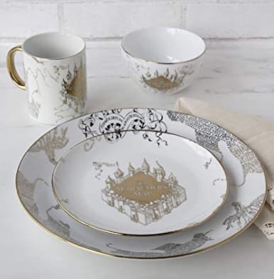 Sin embargo (y por fortuna para nuestra alma Potterhead), es posible tener el preciado mapa en nuestra vajilla, perfecta para tener cenas llenas de magia. El juego incluye un plato de cena, plato de ensalada, tazón y taza, todo grabado con dibujos de oro y escritura. El conjunto es elegante y da un guiño inteligente a la estética de Harry Potter.
