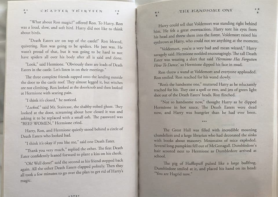 Ese es el título generado por Botnik, así que ya comenzamos por algo realmente raro. Si seguimos leyendo vamos a encontrarnos con algunas otras cosas extrañas. Por ejemplo, a Ron bailando tap en los terrenos del castillo, algo que no se ve todos los días (o se lee).