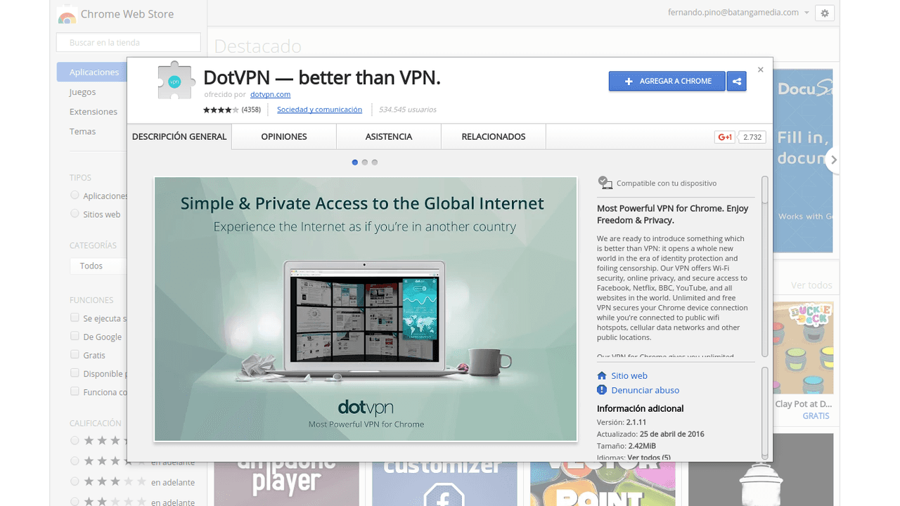 Creado por los mismos desarrolladores de nuestro amado AdBlock DotVPN se instala como un complemento para Google Chrome y si bien no es la VPN más completa si está entre las más simples de utilizar.