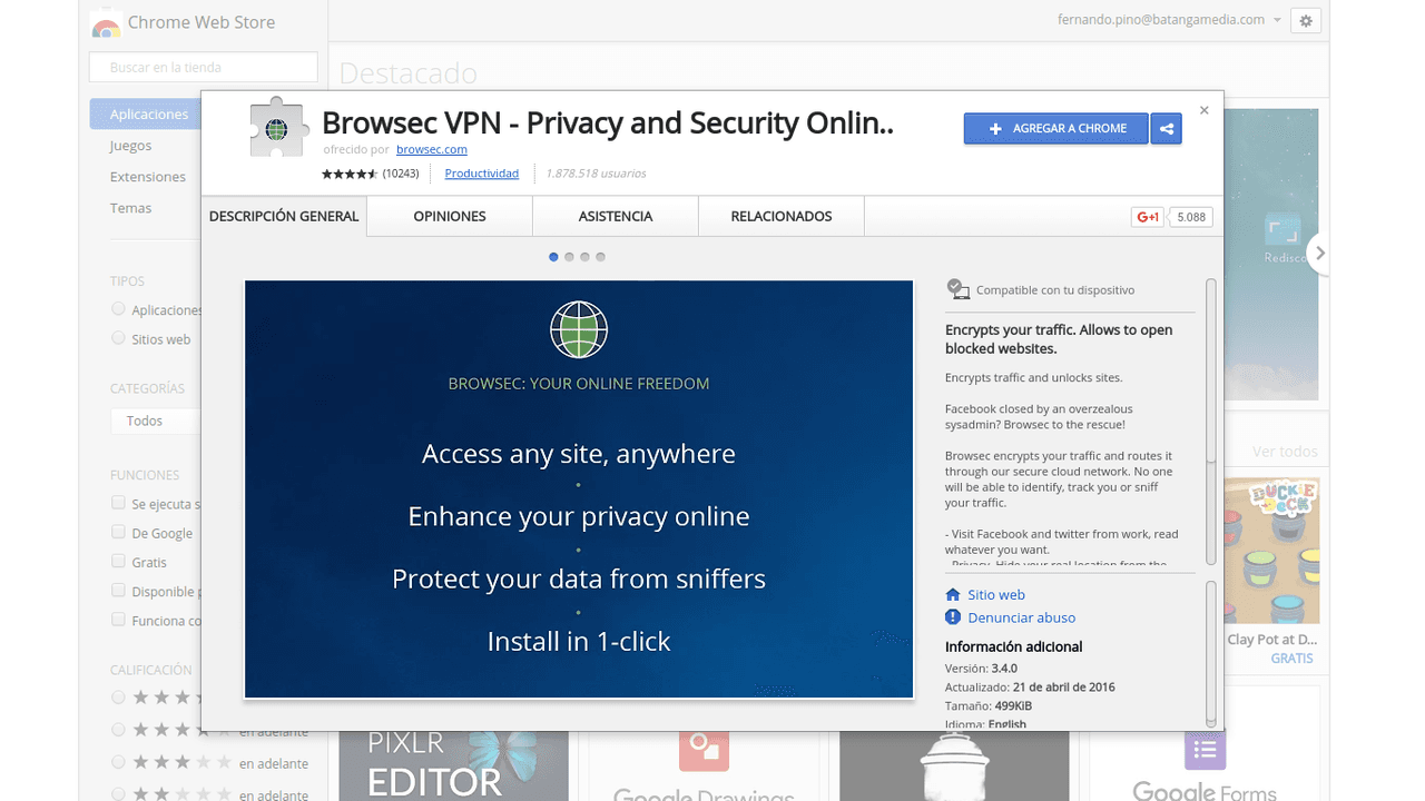 Instala y disfruta, ese es el lema de la extensión Browsec VPN ya que es tan simple de instalar que no creerás que obtienes las funciones que necesitas sin más trabajo. Si bien sus herramientas son más acotadas que las de sus competidores la mayoría de las personas no requiere más.